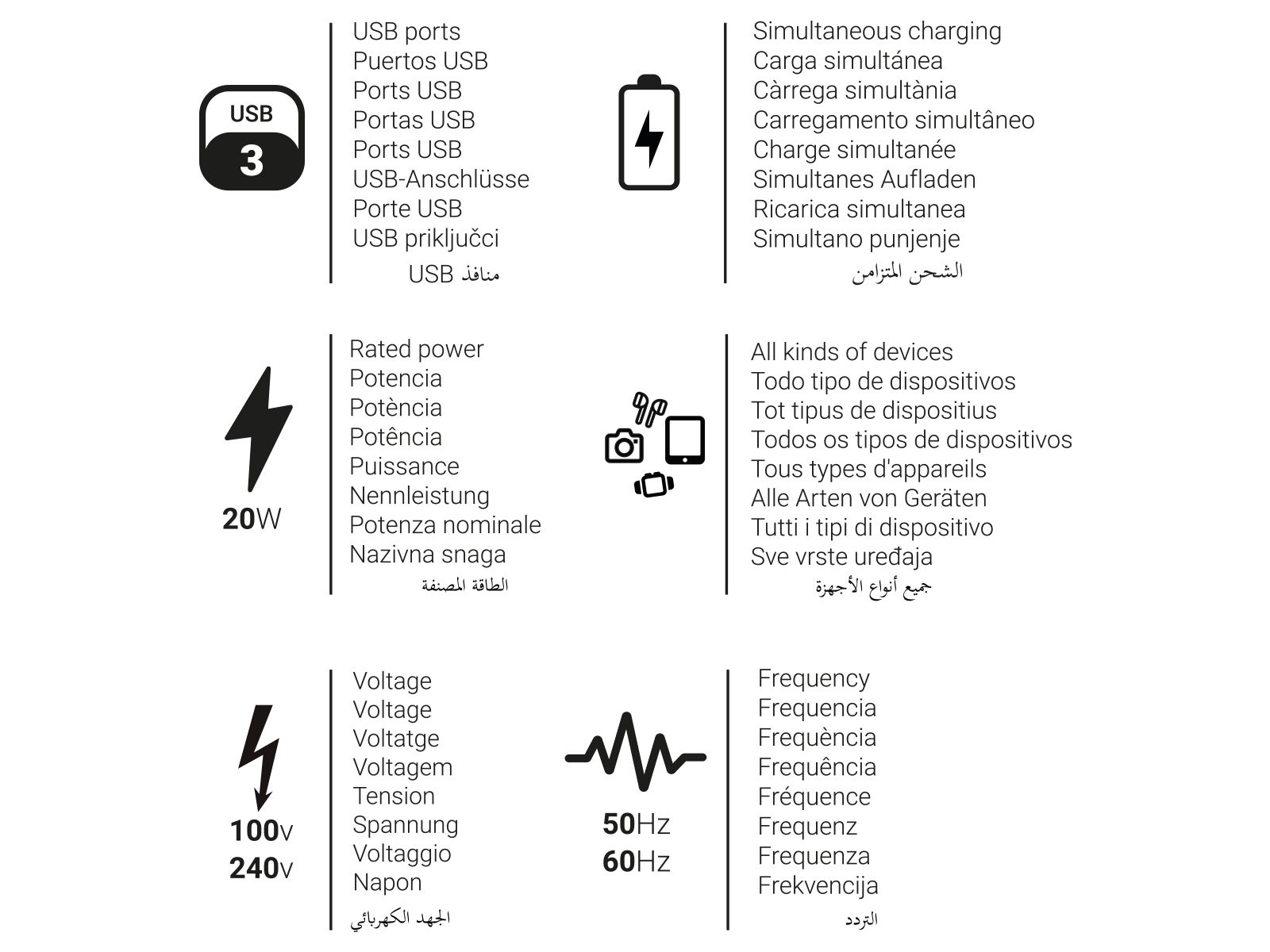 - Tripla carga: Não se preocupe com a falta de tomadas, a sua capacidade para carregar três dispositivos ao mesmo tempo irá salvá-lo de apuros.