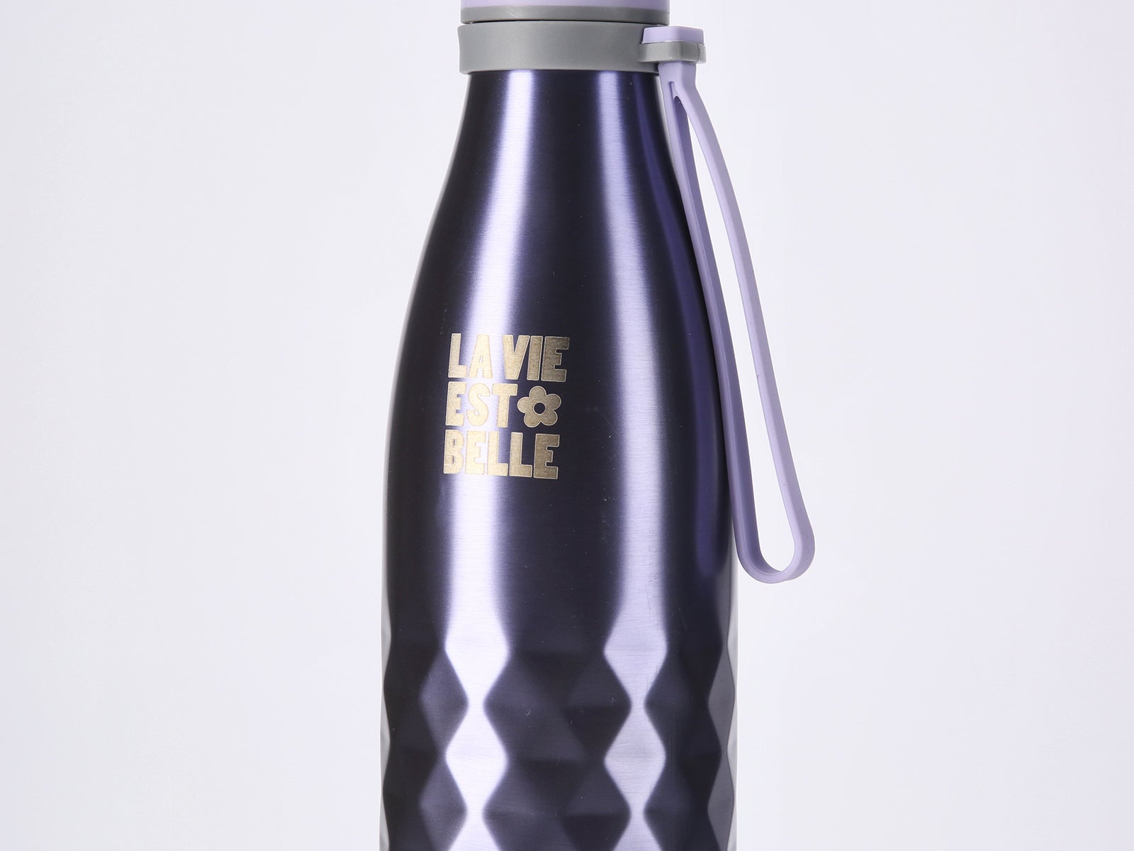 - Design elegante: garrafa de metal com acabamento roxo brilhante e frase inspiradora La vie est belle.