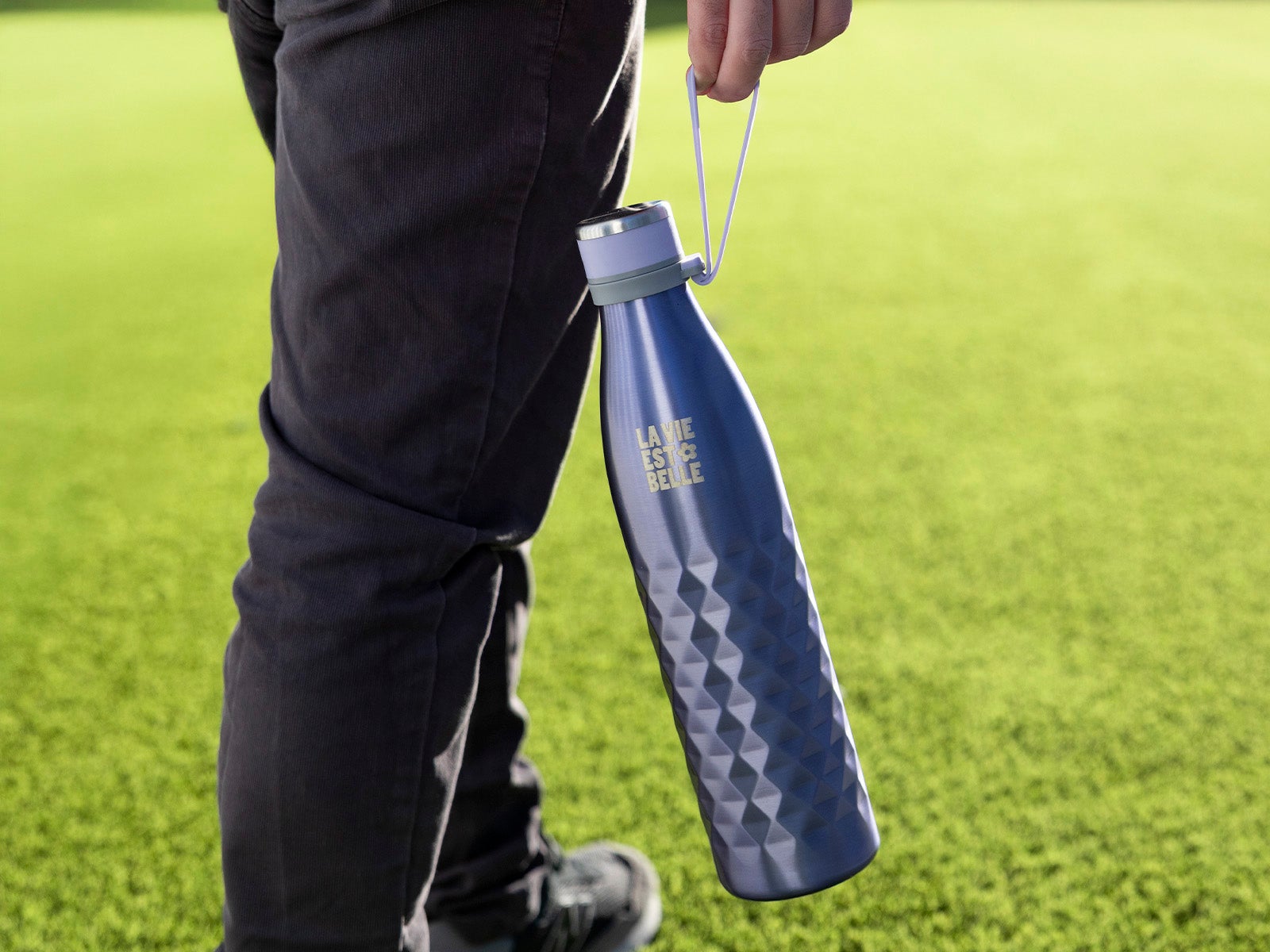 Dá um toque chique à tua rotina com a Garrafa de aço inoxidável roxa brilhante - La vie est belle. O seu acabamento brilhante e a sua mensagem positiva lembrar-te-ão que a vida se desfruta gole a gole, seja no escritório, na aula ou em aventura pelo mundo.