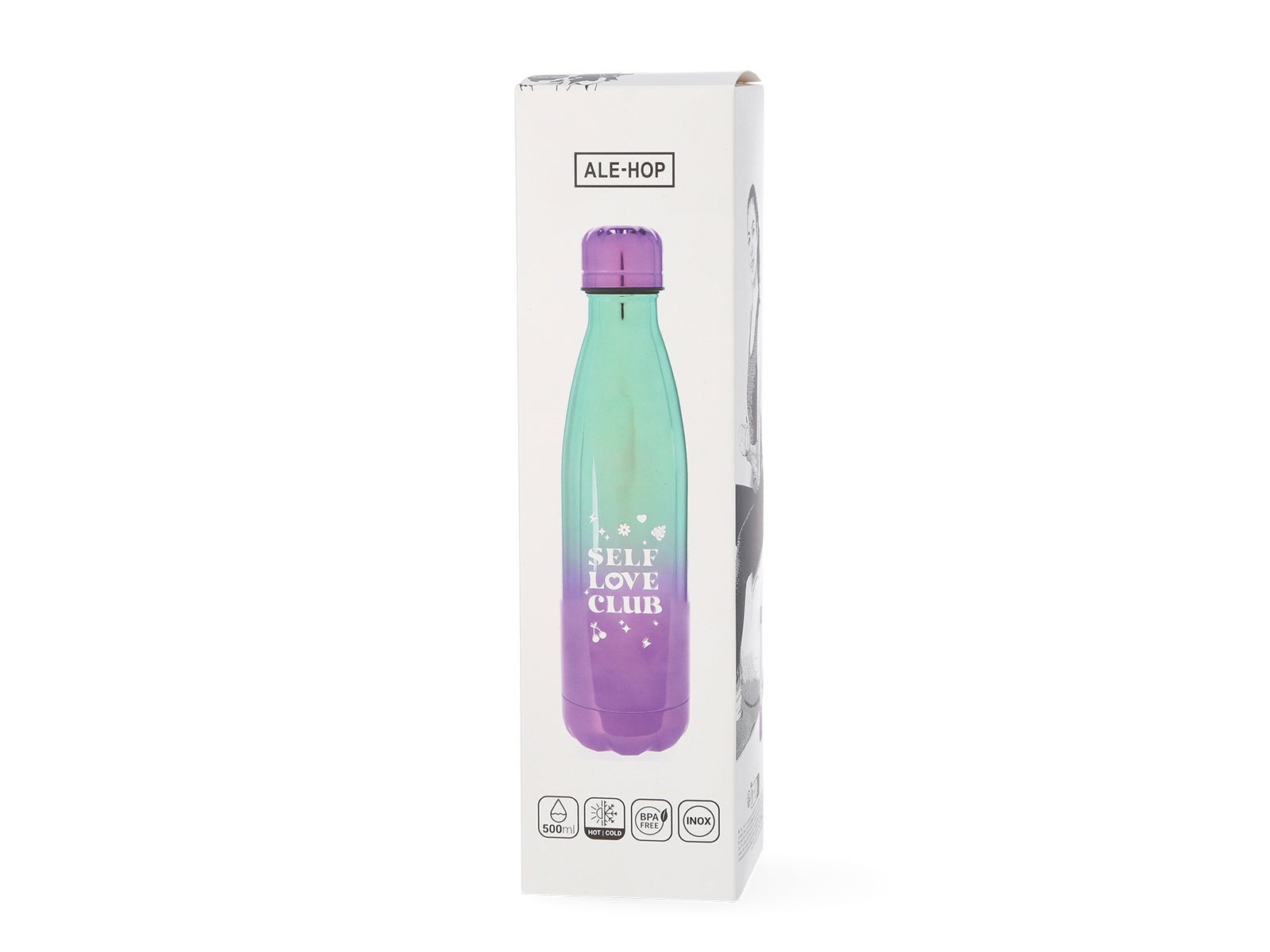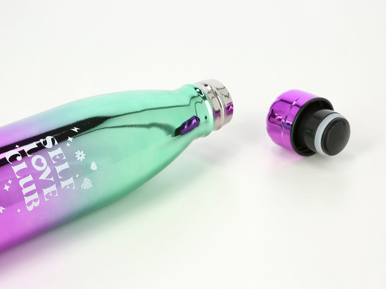 Pronto para aderir ao clube do amor próprio com estilo e consciência ecológica? Descobre a garrafa de aço iridescente SELF LOVE CLUB da ALE-HOP e leva a tua hidratação a outro nível.