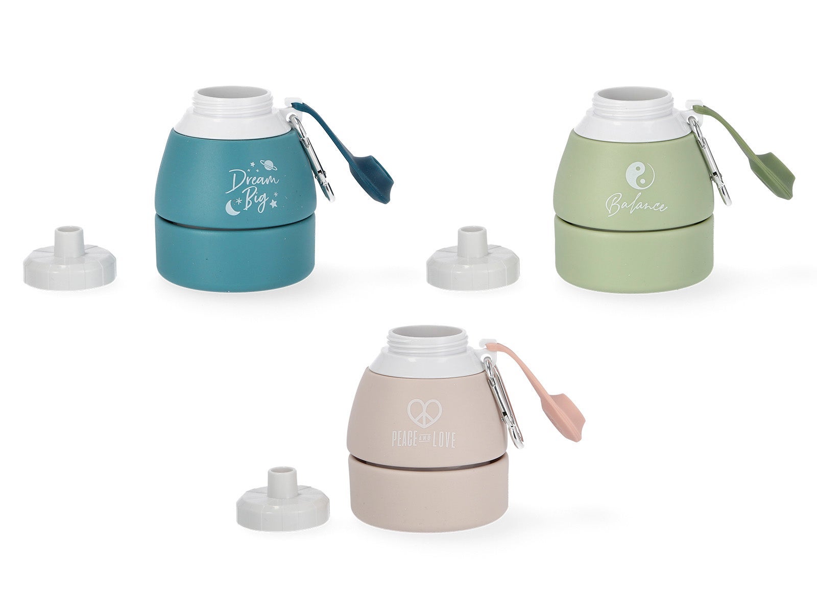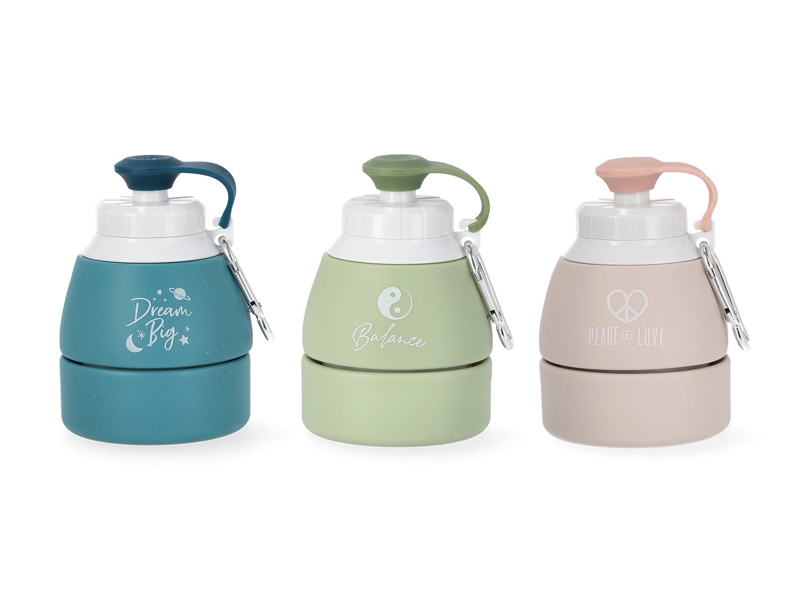 Estas garrafas dobráveis de silicone vêm em três cores vibrantes: azul escuro, verde e bege. Cada cor realça uma mensagem positiva única: "Dream Big", "Balance" e "Peace Love", respetivamente. Perfeitas para o otimista que há em ti.