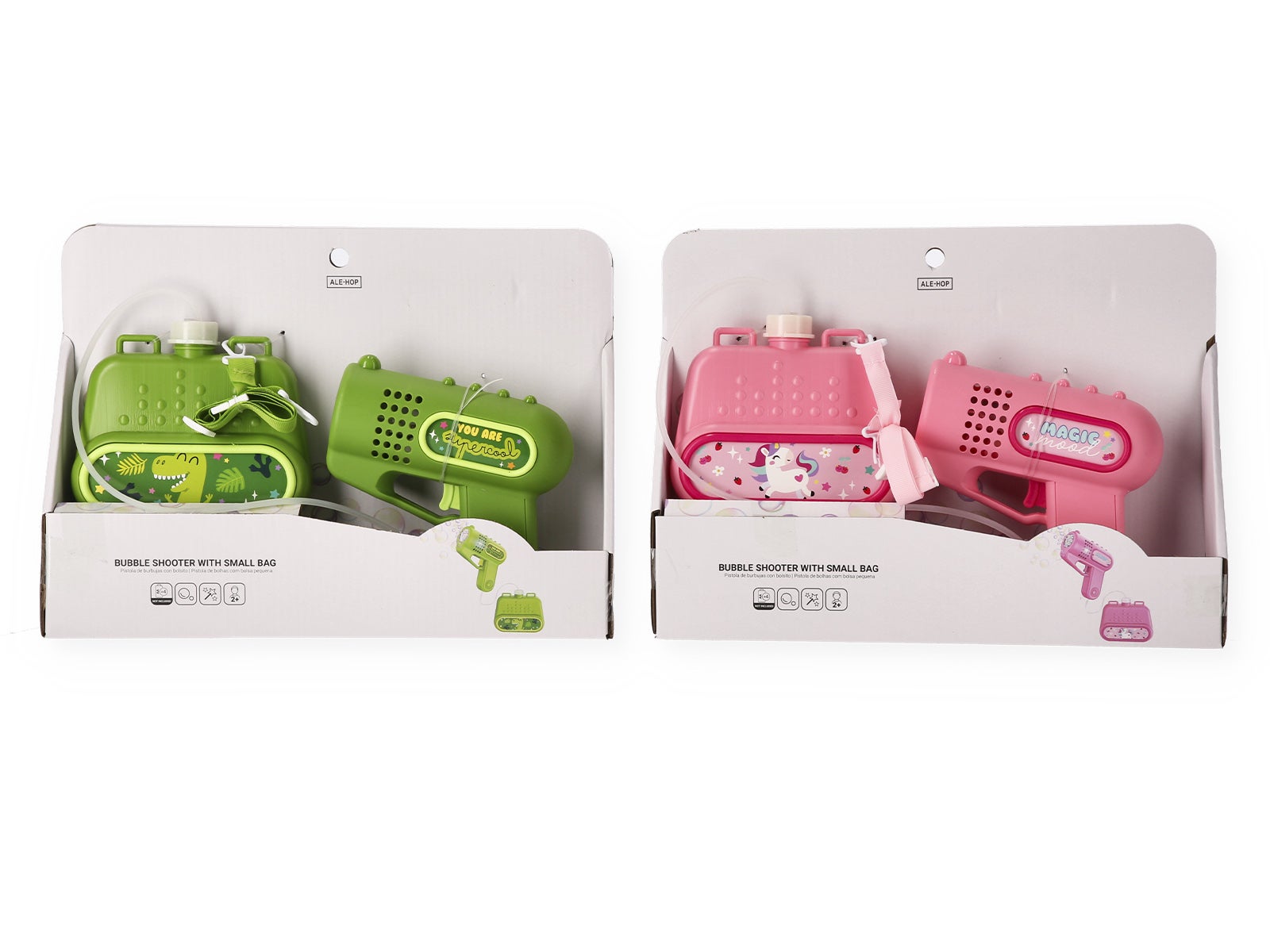 Diversão ininterrupta com o Geleira com pistola de bolhas da ALE-HOP! Um conjunto prático e original com depósito pendurado para que as bolhas não parem. Ideal para a praia e o parque.