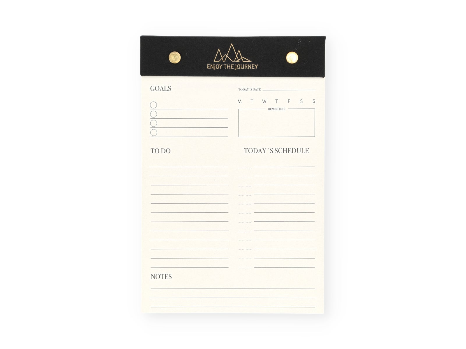 - Design motivador: Na sua capa preta destaca-se a mensagem brilhante "ENJOY THE JOURNEY", junto a um logotipo de montanhas, incitando-te a desfrutar do caminho de cada dia.