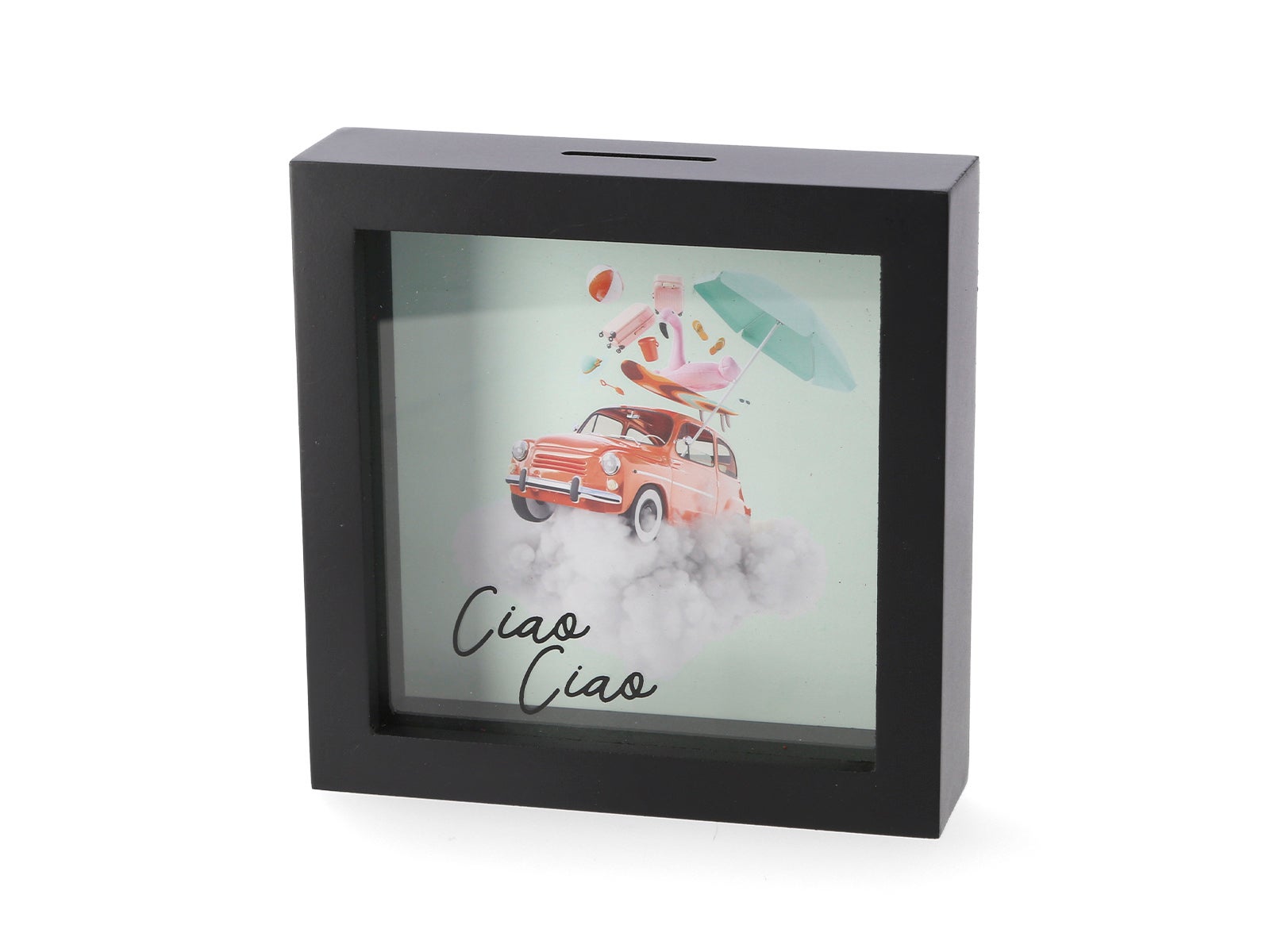 Design atraente: Frontal transparente para que possas ver como as tuas poupanças vão crescendo. Um fundo com uma imagem motivadora e a frase "Ciao Ciao".