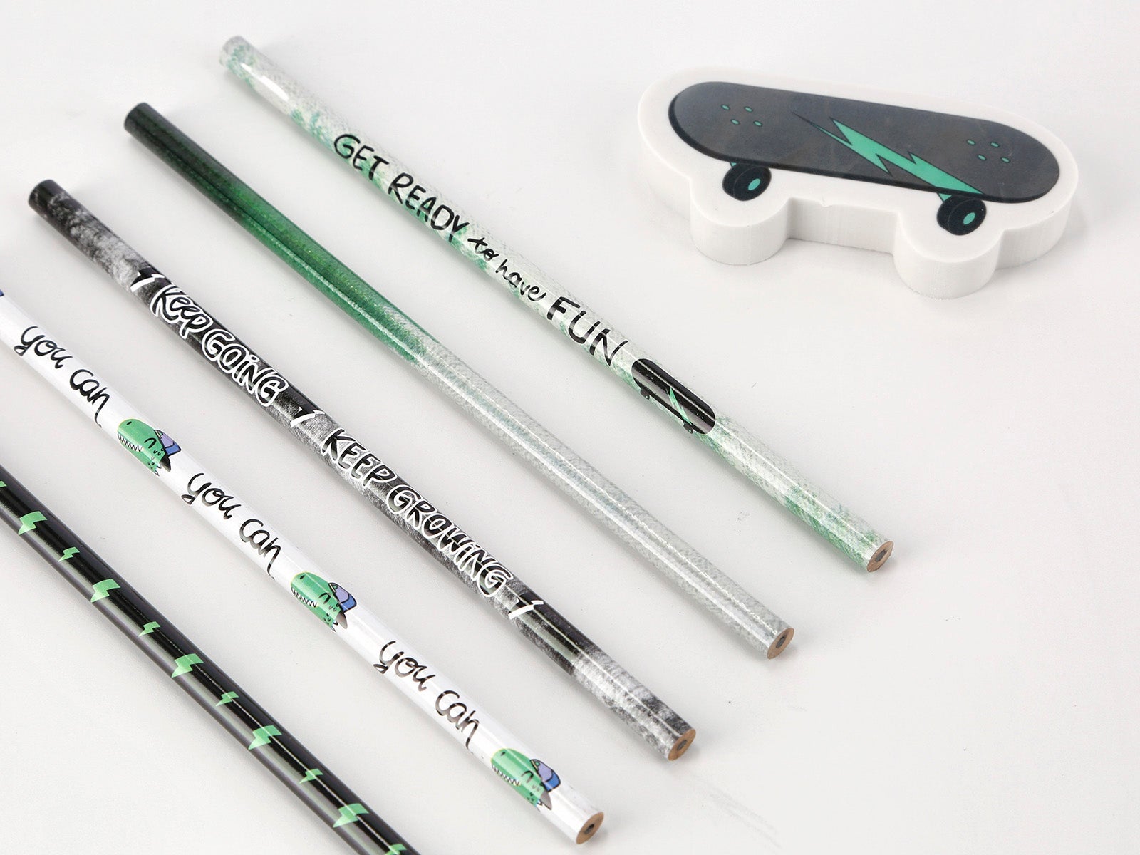 <li><strong>Design jovem e descontraído:</strong> Cada lápis apresenta o seu próprio padrão e frases como "GET READY to have FUN", "KEEP GOING you can" e "KEEP GROWING", que vão encorajar as crianças a continuarem a desenhar e a criar sem parar.</li>