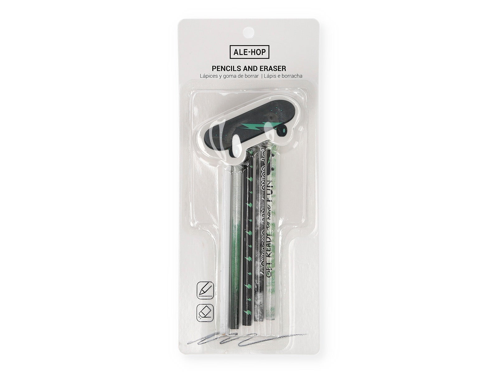 Com o Conjunto de 5 lápis e borracha trotinete da ALE-HOP, fazer trabalhos escolares ou simplesmente desenhar será a atividade mais divertida do dia. Este estojo inclui cinco lápis com frases motivacionais e designs únicos, juntamente com uma borracha com forma de trotinete que será a inveja de toda a turma.